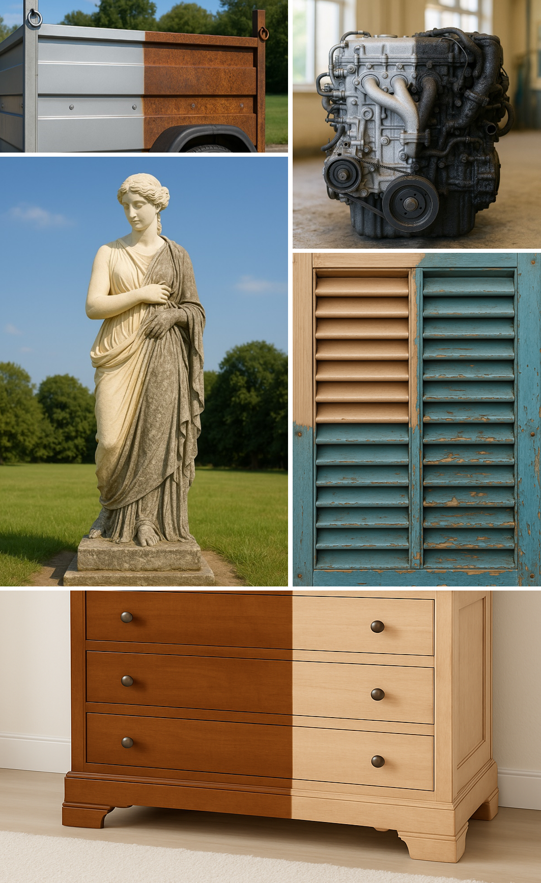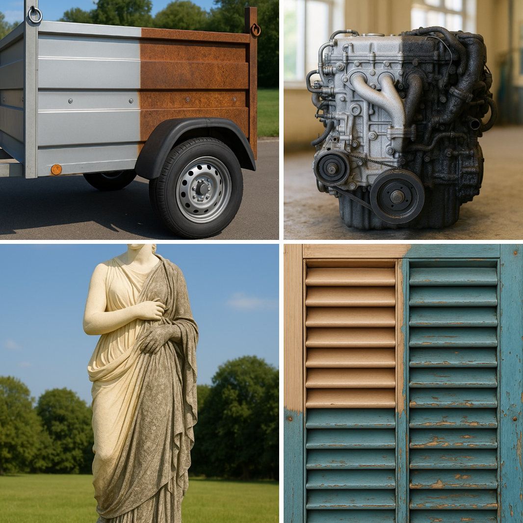 Menuisiers, carrossiers, restaurateurs, artisans du bâtiment… L’aérogommage offre une solution efficace pour préparer les supports avant traitement : nettoyage de pièces métalliques, enlèvement de la rouille, rénovation de portails en fer forgé, décapage de véhicules anciens ou de volets avant peinture. Un travail net, rapide, sans poussière excessive.
