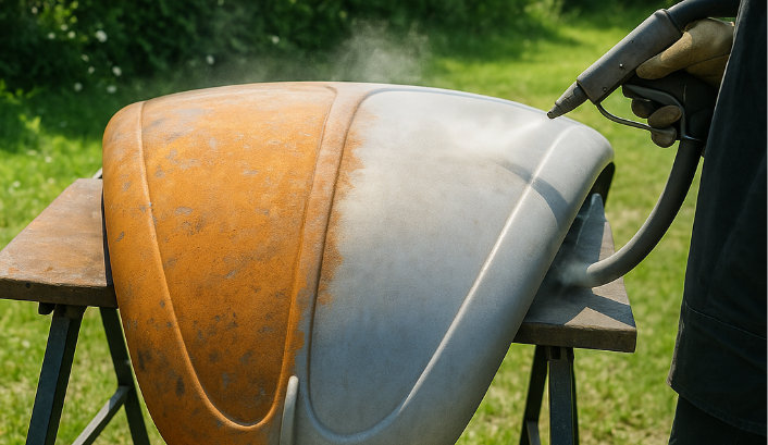 Le décapage des métaux par aérogommage est une solution efficace et non agressive pour nettoyer, rénover et préparer vos surfaces métalliques. Que ce soit pour retirer la rouille, enlever une vieille peinture ou préparer un support avant traitement, l’aérogommage offre un décapage précis sans altérer ni déformer le métal. Cette technique à sec utilise de fines poudres naturelles comme le garnet, projetées à basse pression, pour décaper en douceur les portails, radiateurs, volets métalliques, pièces auto ou objets en fer forgé. Contrairement au sablage classique, l’aérogommage respecte l’intégrité des surfaces métalliques, même les plus fragiles.